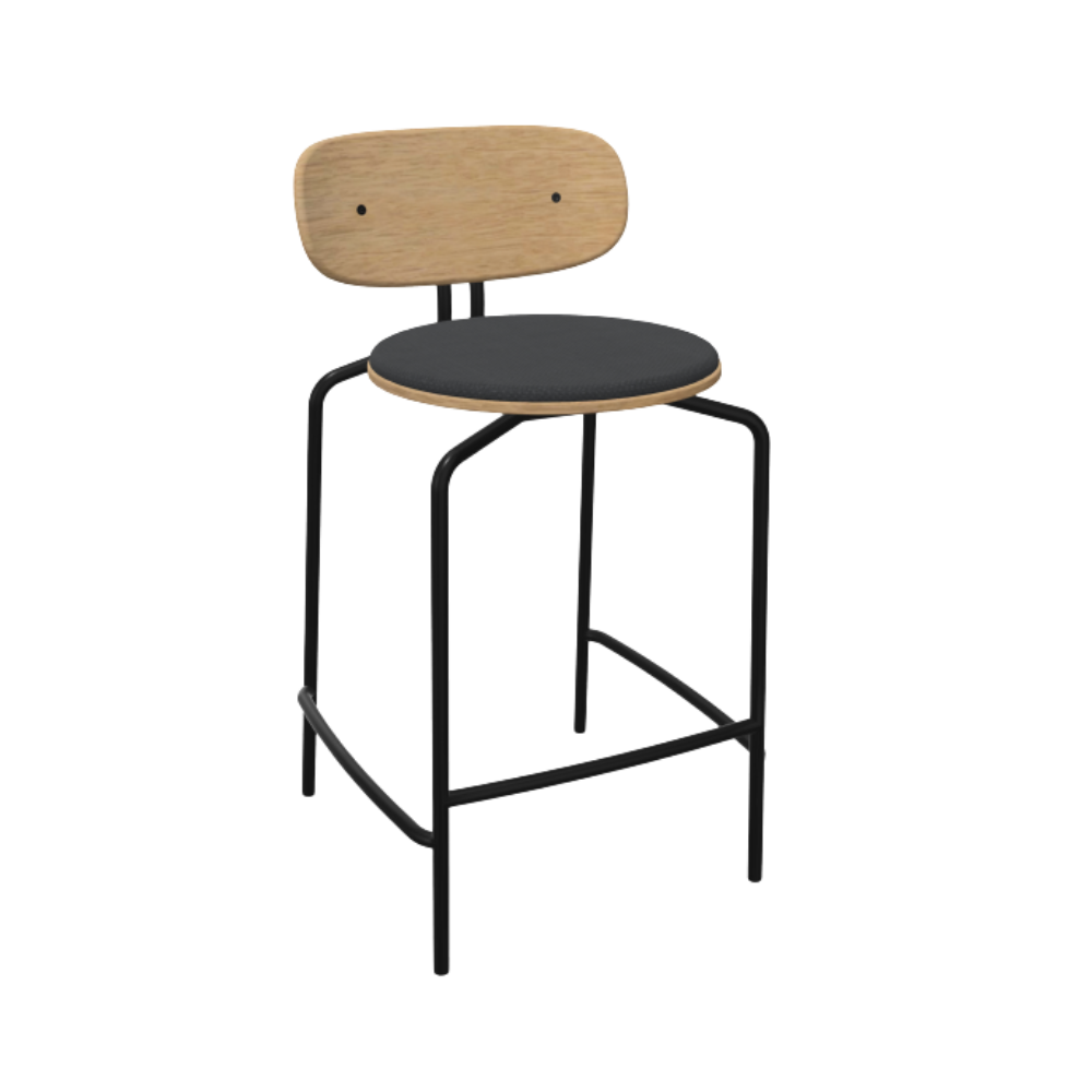 Curious Counterstolen fra Umage forener moderne minimalisme med bæredygtige materialer. Den let buede skal i egefiner hviler på et sort stålstel, mens sædet er beklædt med genanvendt polyester – både slidstærkt og behageligt.