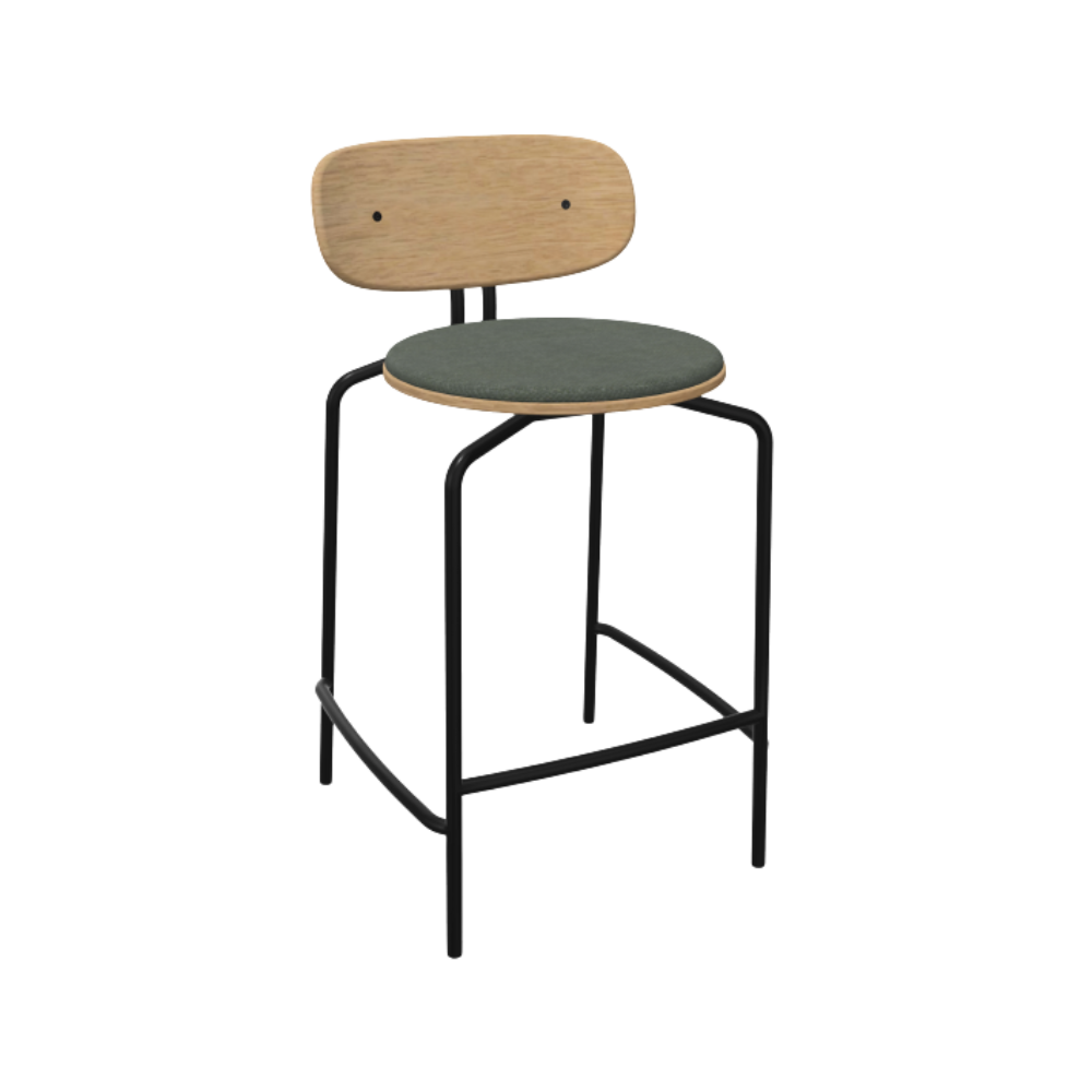 Curious Counterstolen fra Umage forener moderne minimalisme med bæredygtige materialer. Den let buede skal i egefiner hviler på et sort stålstel, mens sædet er beklædt med genanvendt polyester – både slidstærkt og behageligt.
