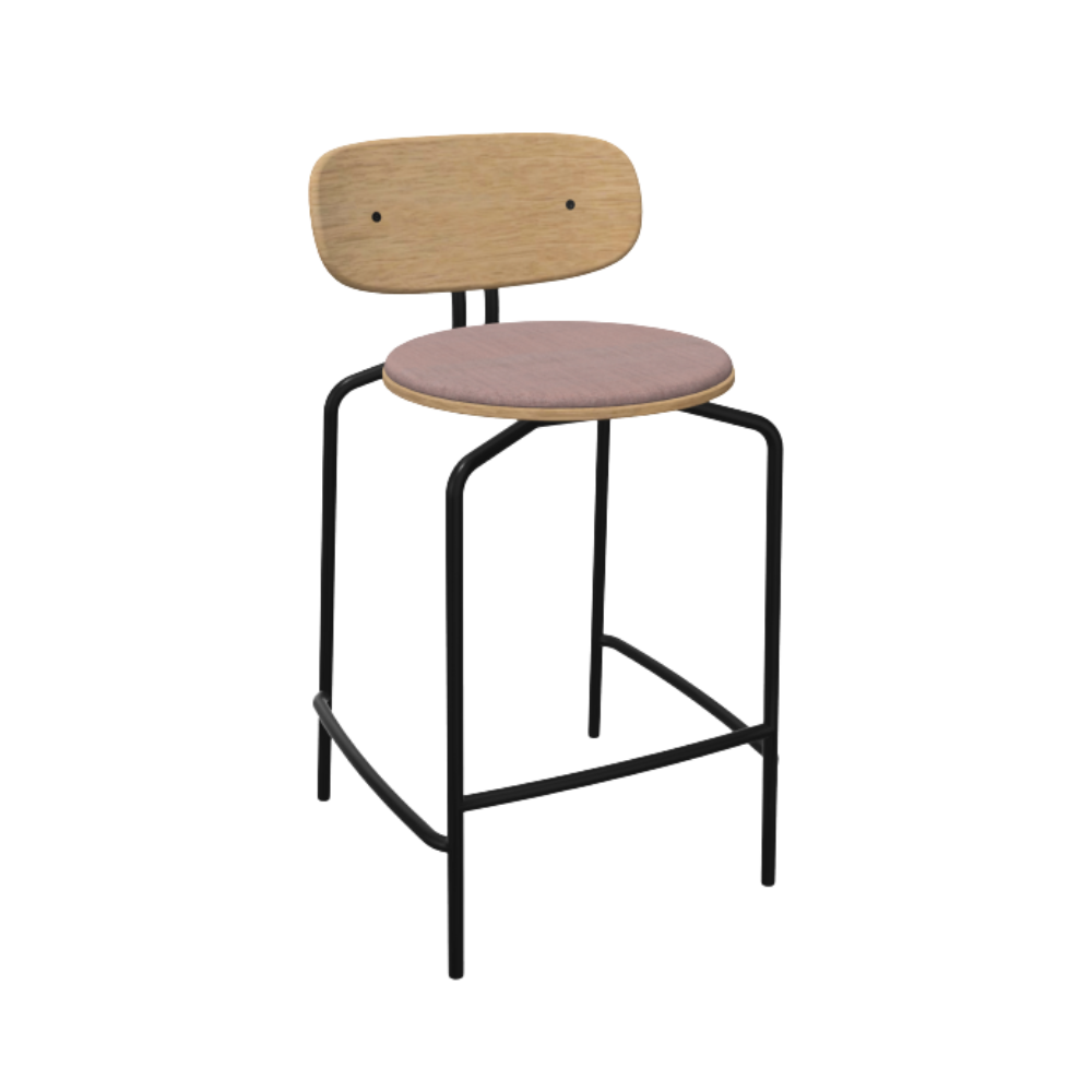 Curious Counterstolen fra Umage forener moderne minimalisme med bæredygtige materialer. Den let buede skal i egefiner hviler på et sort stålstel, mens sædet er beklædt med genanvendt polyester – både slidstærkt og behageligt.