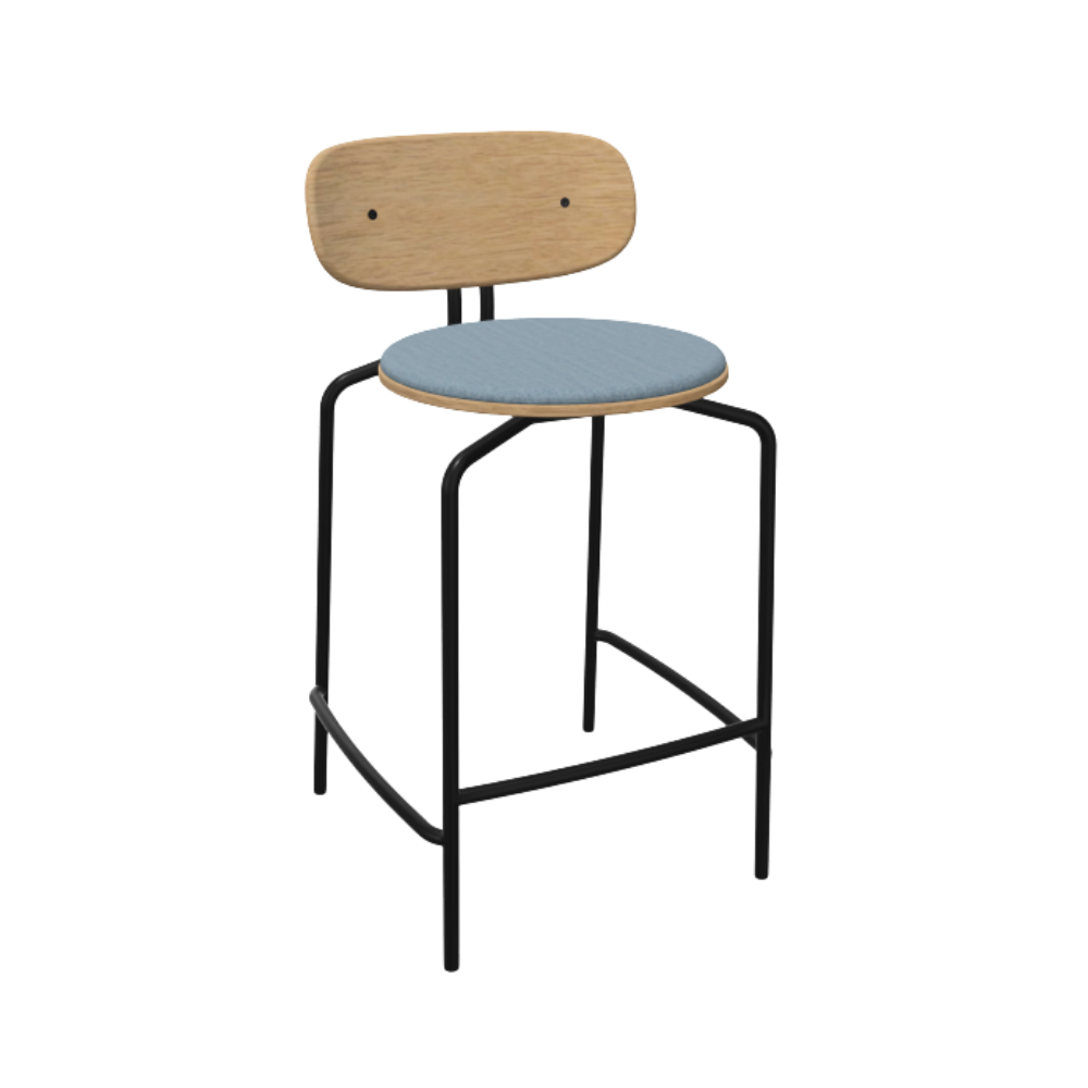Curious Counterstolen fra Umage forener moderne minimalisme med bæredygtige materialer. Den let buede skal i egefiner hviler på et sort stålstel, mens sædet er beklædt med genanvendt polyester – både slidstærkt og behageligt.