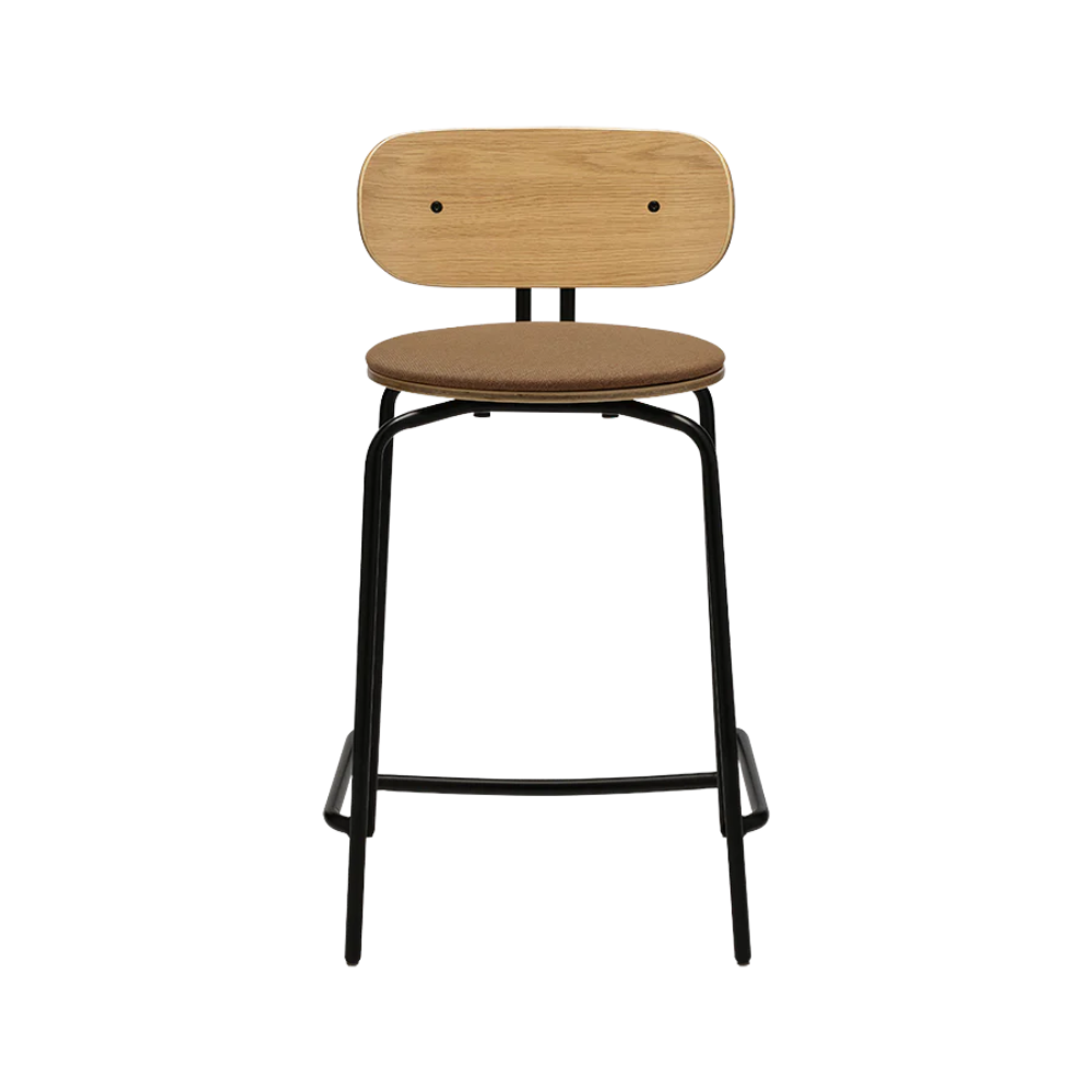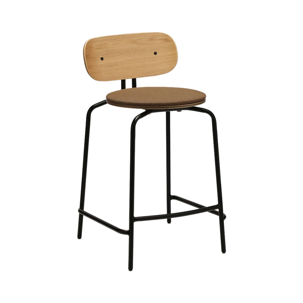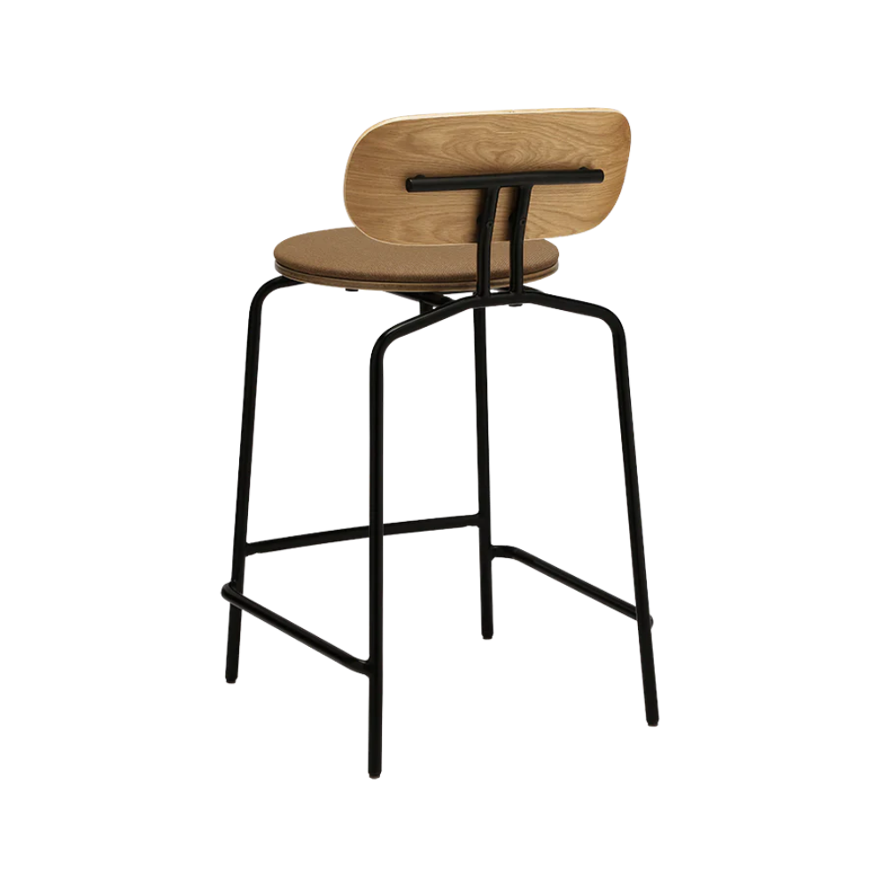 Curious Counterstolen fra Umage forener moderne minimalisme med bæredygtige materialer. Den let buede skal i egefiner hviler på et sort stålstel, mens sædet er beklædt med genanvendt polyester – både slidstærkt og behageligt.