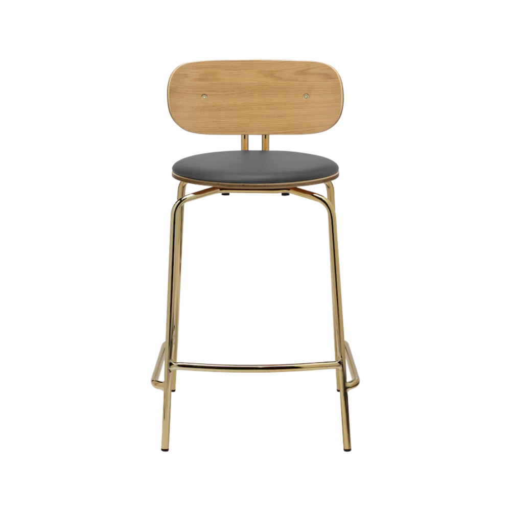 Curious Counterstolen fra Umage udstråler eksklusiv ro med sine klassiske materialer og skarpe linjer. Det varme egefiner kombineres med et stel i messing og et sæde betrukket med læder – en kombination, der både føles luksuriøs og tidløs.