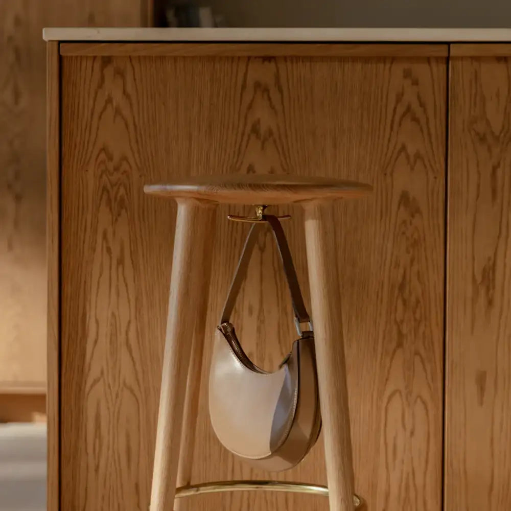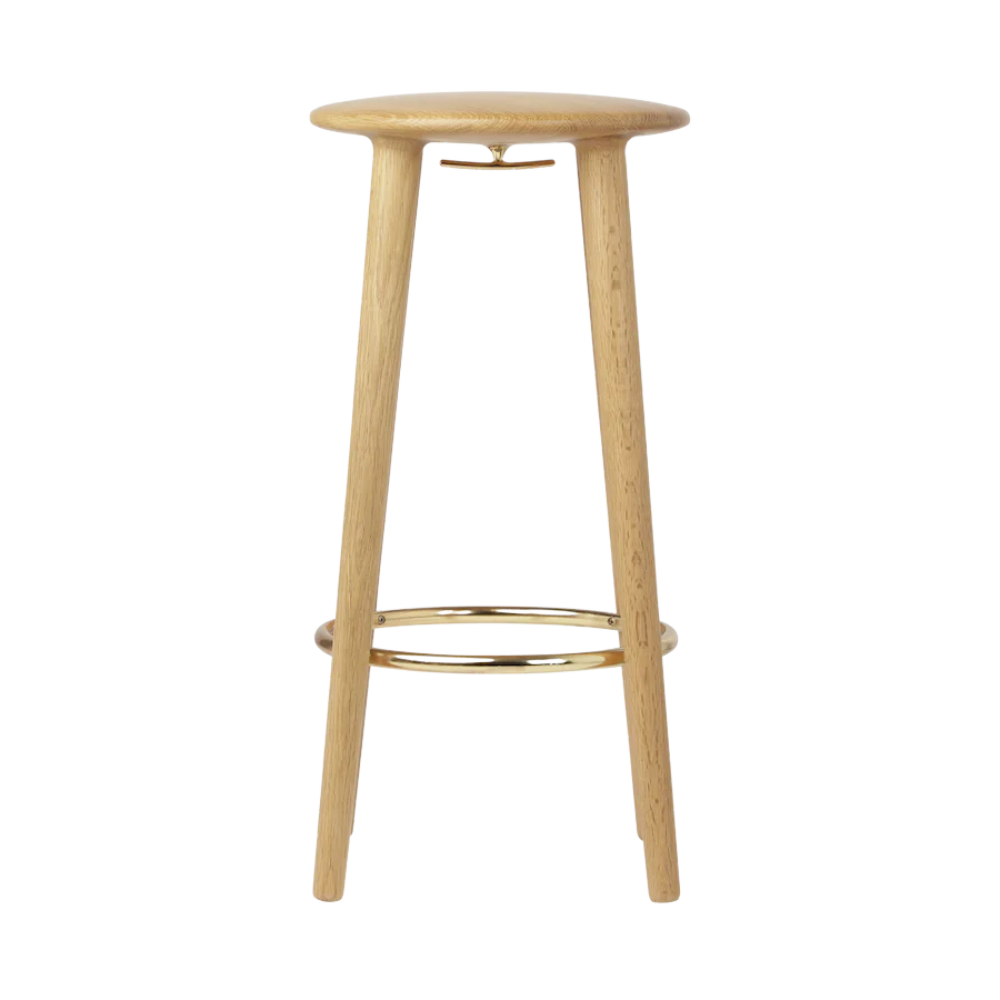Det solide sæde i massiv eg er formet med bløde kurver for optimal siddekomfort, mens fodstøtten og den diskrete krog under sædet tilføjer praktiske løsninger, som gør stolen velegnet til både hverdag og gæstebesøg. Messingdetaljen under sædet fungerer både som ophæng og et elegant designelement.
