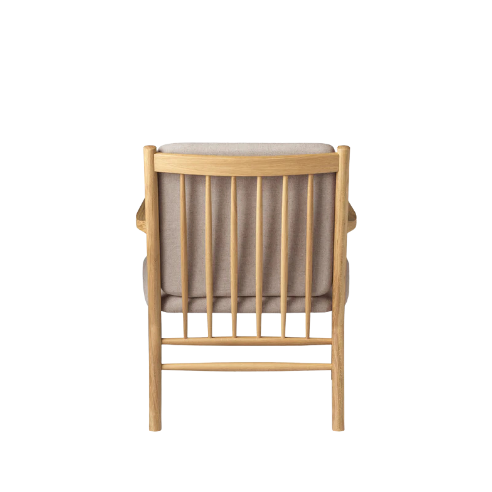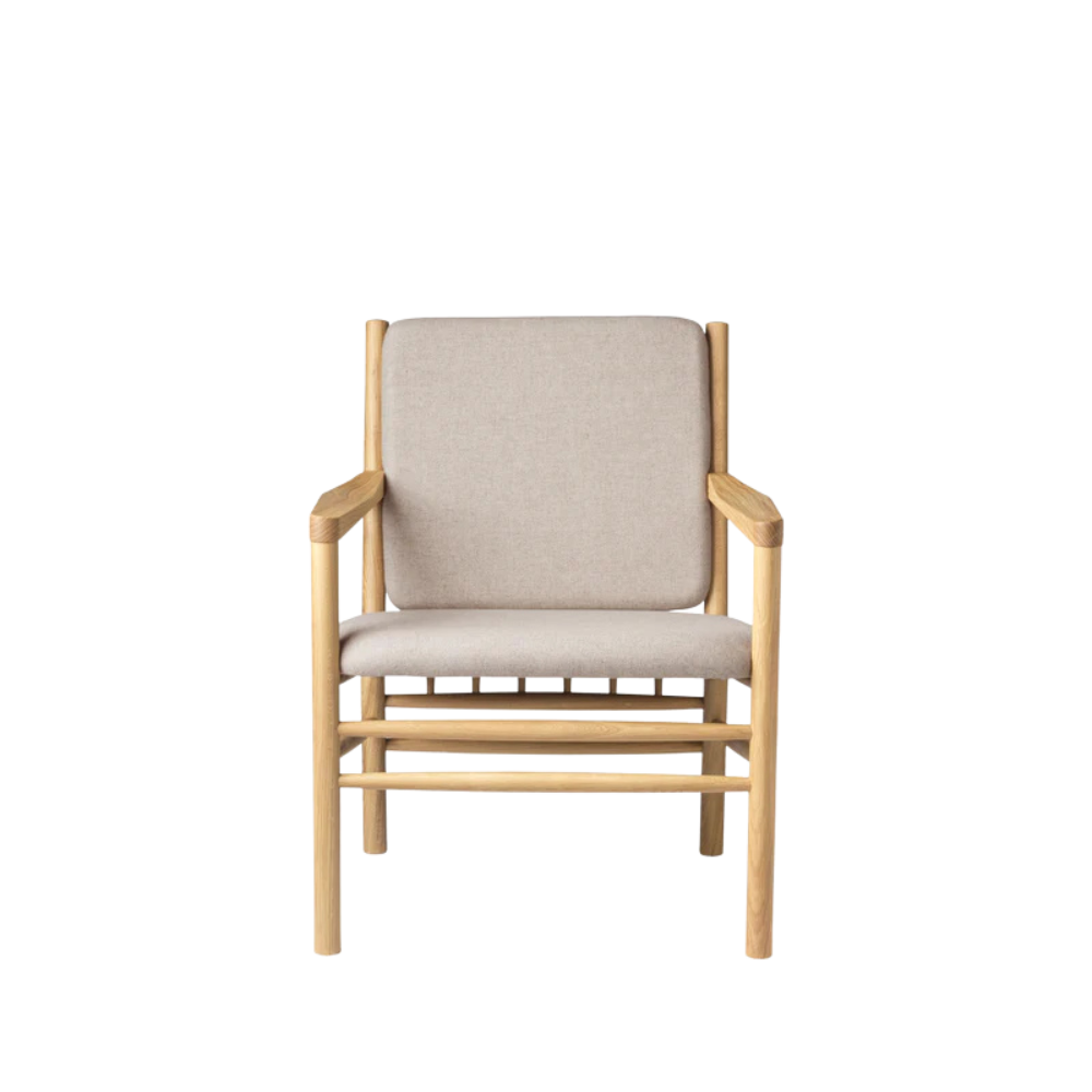Den solide ramme i massiv lakeret eg kombineres her med det bæredygtige tekstil Main Line Flax – et slidstærkt og miljøvenligt materiale, der giver stolen et naturligt og sanseligt udtryk. De bløde linjer og den generøse siddekomfort gør J147 til et møbel, du har lyst til at blive i.
