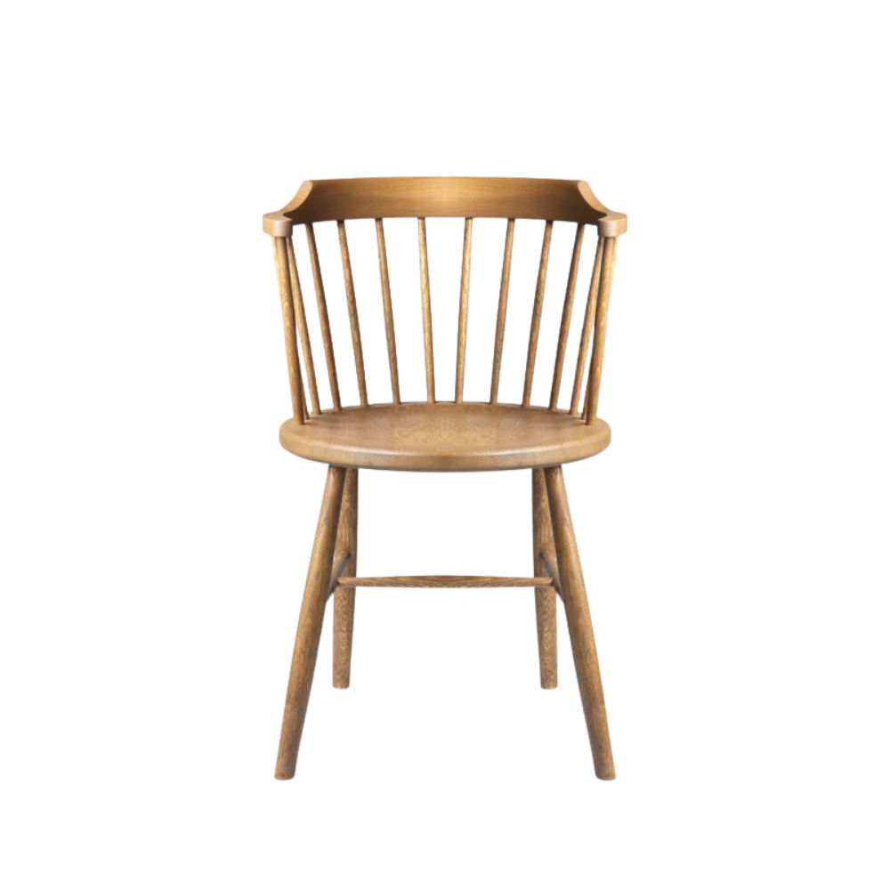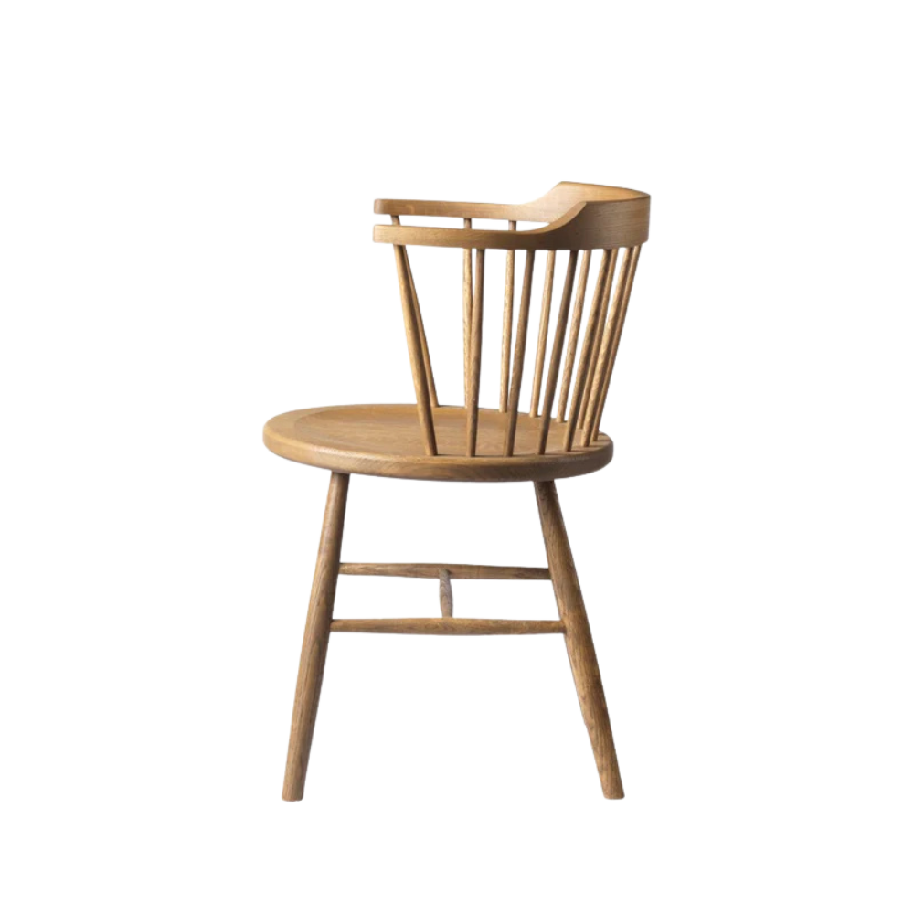 FDB J18 spisebordsstol med armlæn Børge Mogensen er et ikonisk møbel, der forener klassisk dansk design med funktionel komfort. Stolen er fremstillet i brunolieret eg, hvilket giver den en varm glød og fremhæver træets naturlige årer.