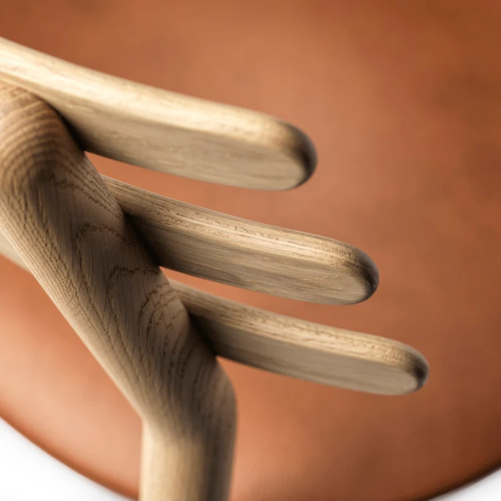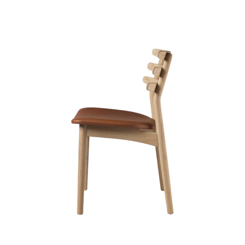 Denne udgave er udført i massiv eg med vandbaseret lak, som beskytter overfladen og fremhæver træets naturlige struktur. Sædet er polstret med læder, hvilket tilføjer både elegance og ekstra siddekomfort.