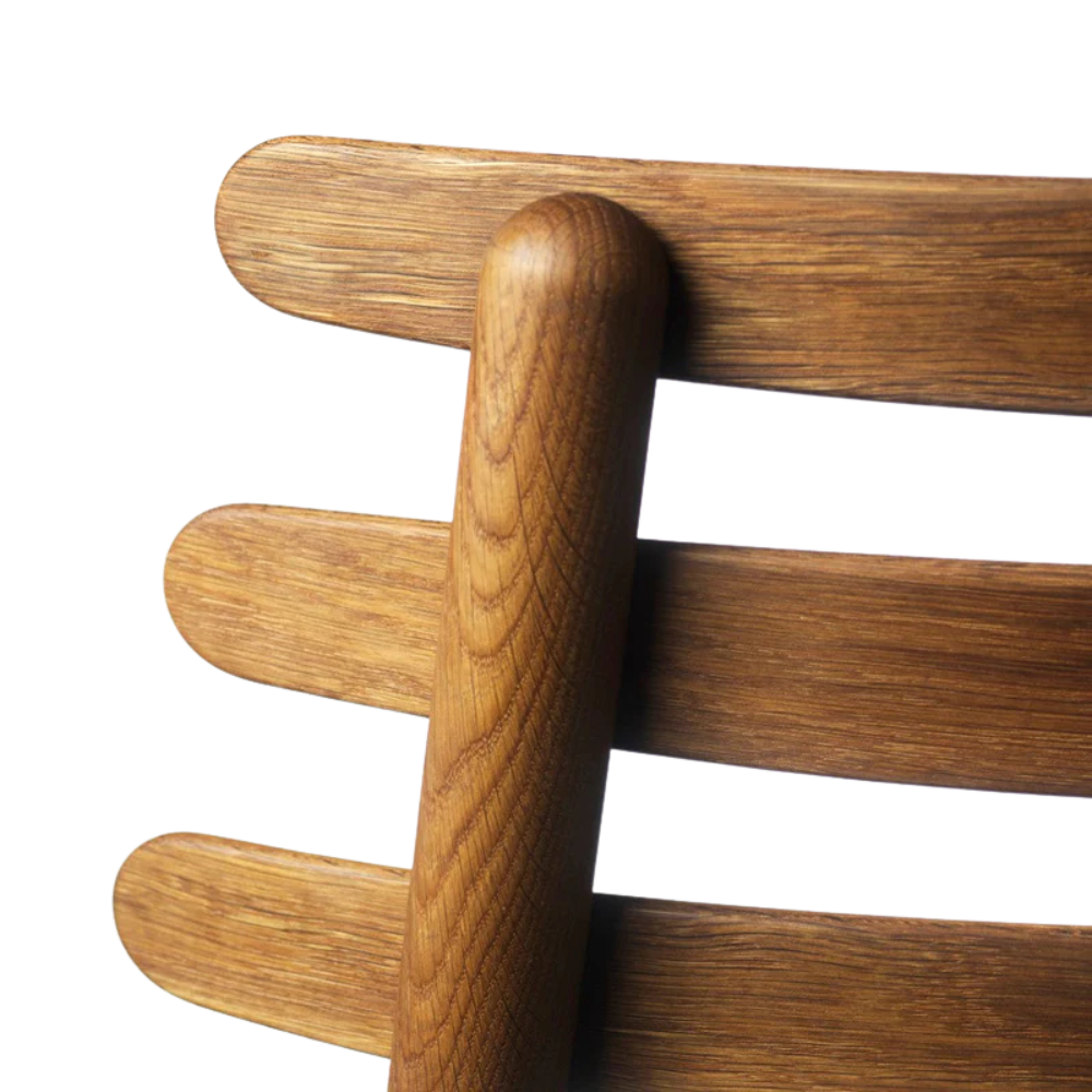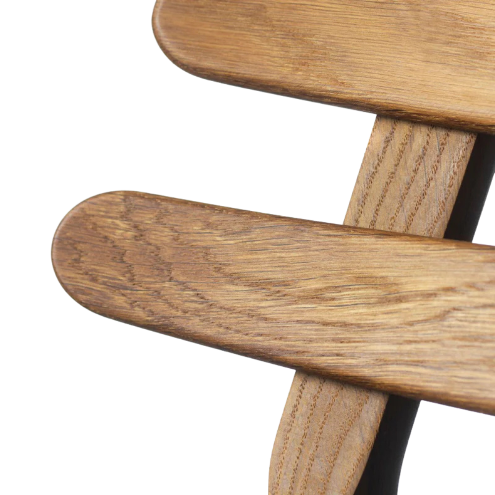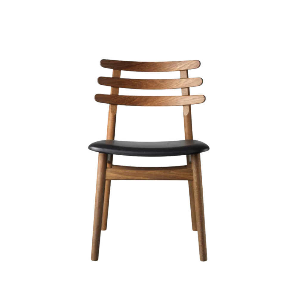 Stolens mørke træ og elegante finish giver et markant udtryk, som passer perfekt ind i det moderne, skandinaviske hjem. De tre vandrette rygstykker giver ikke kun karakter, men også en behagelig støtte til ryggen.