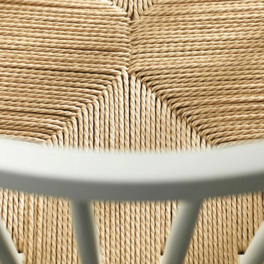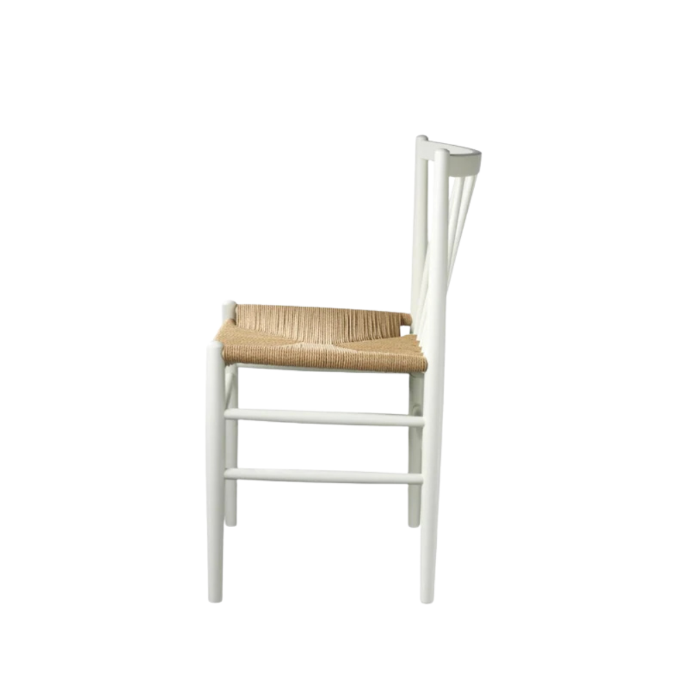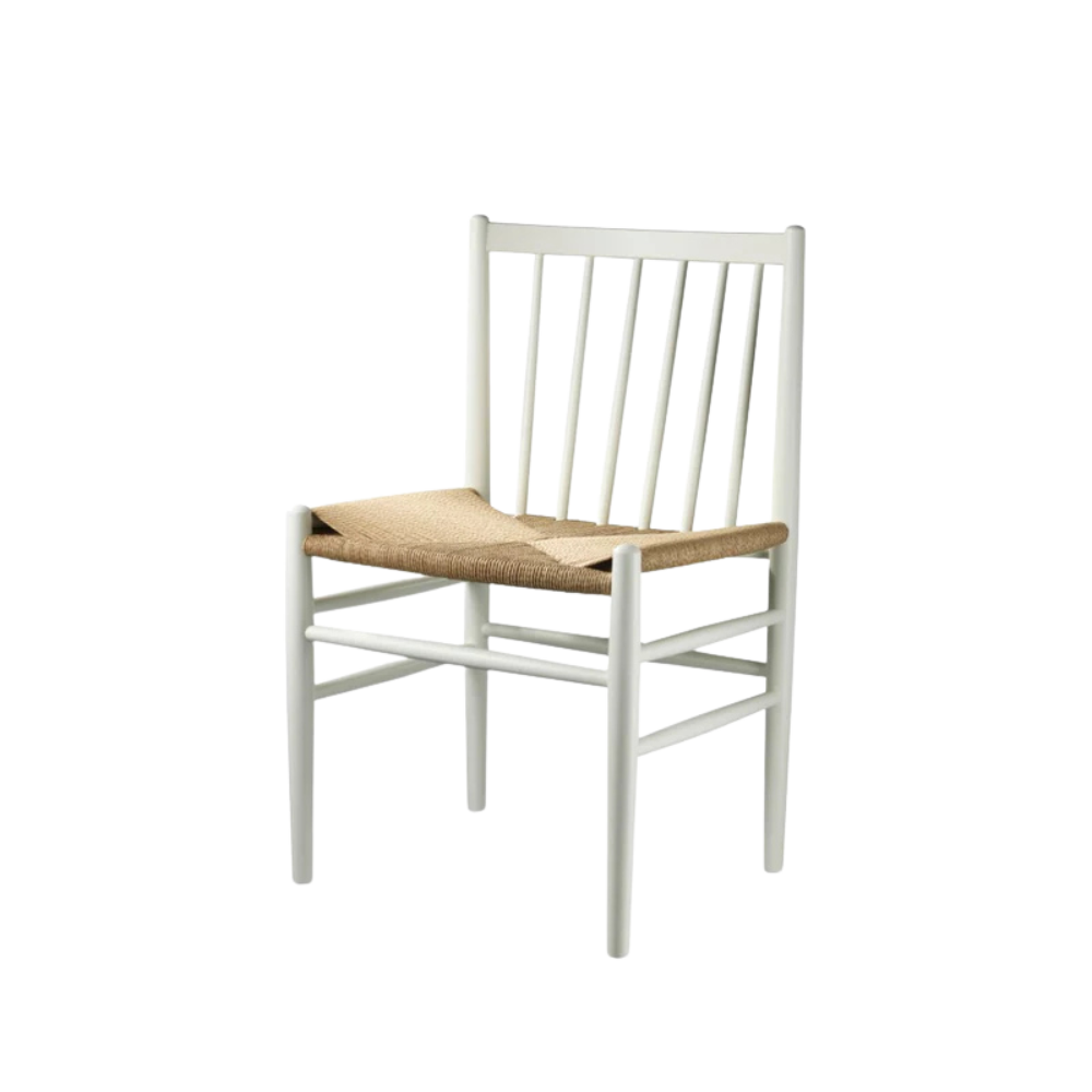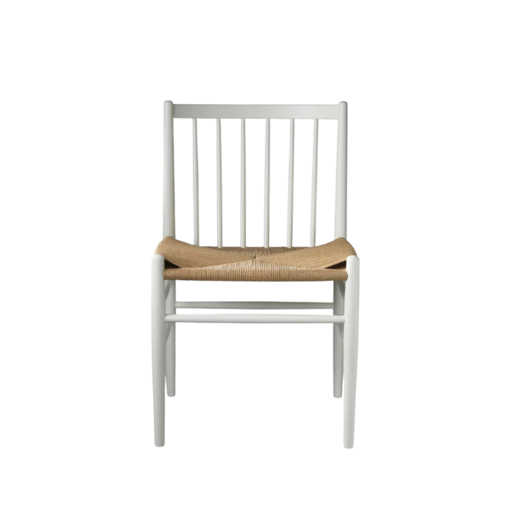 Denne udgave er fremstillet i malet bøg med et sæde i flettet papercord. Kombinationen skaber et raffineret udtryk, hvor det malede træ fremhæver stolens rene linjer, mens papercord-flettet giver både varme og håndværksmæssig detalje.