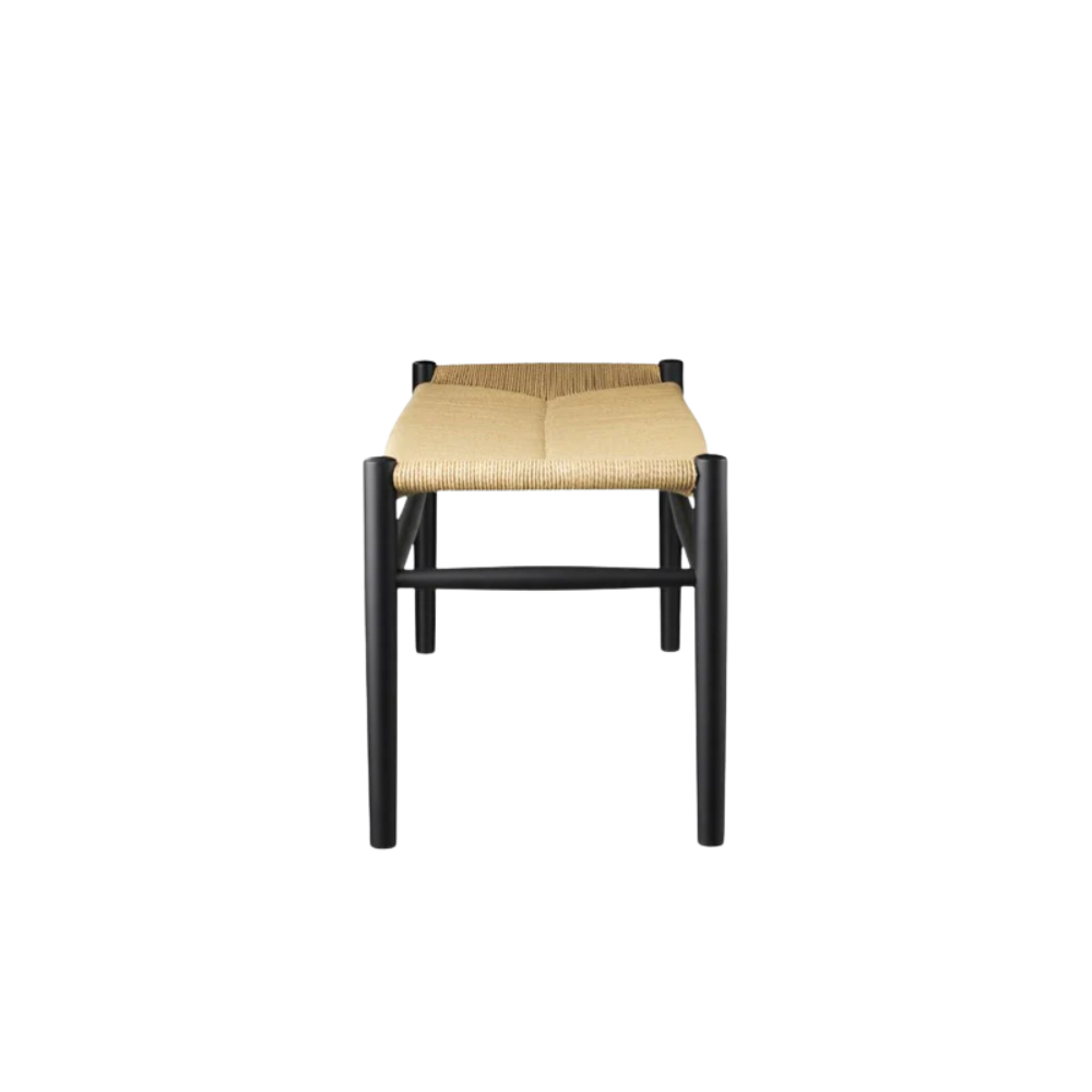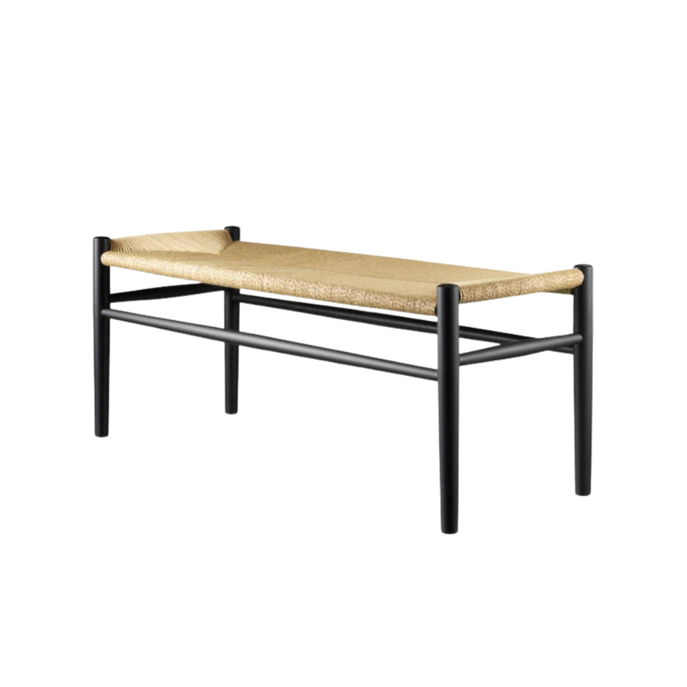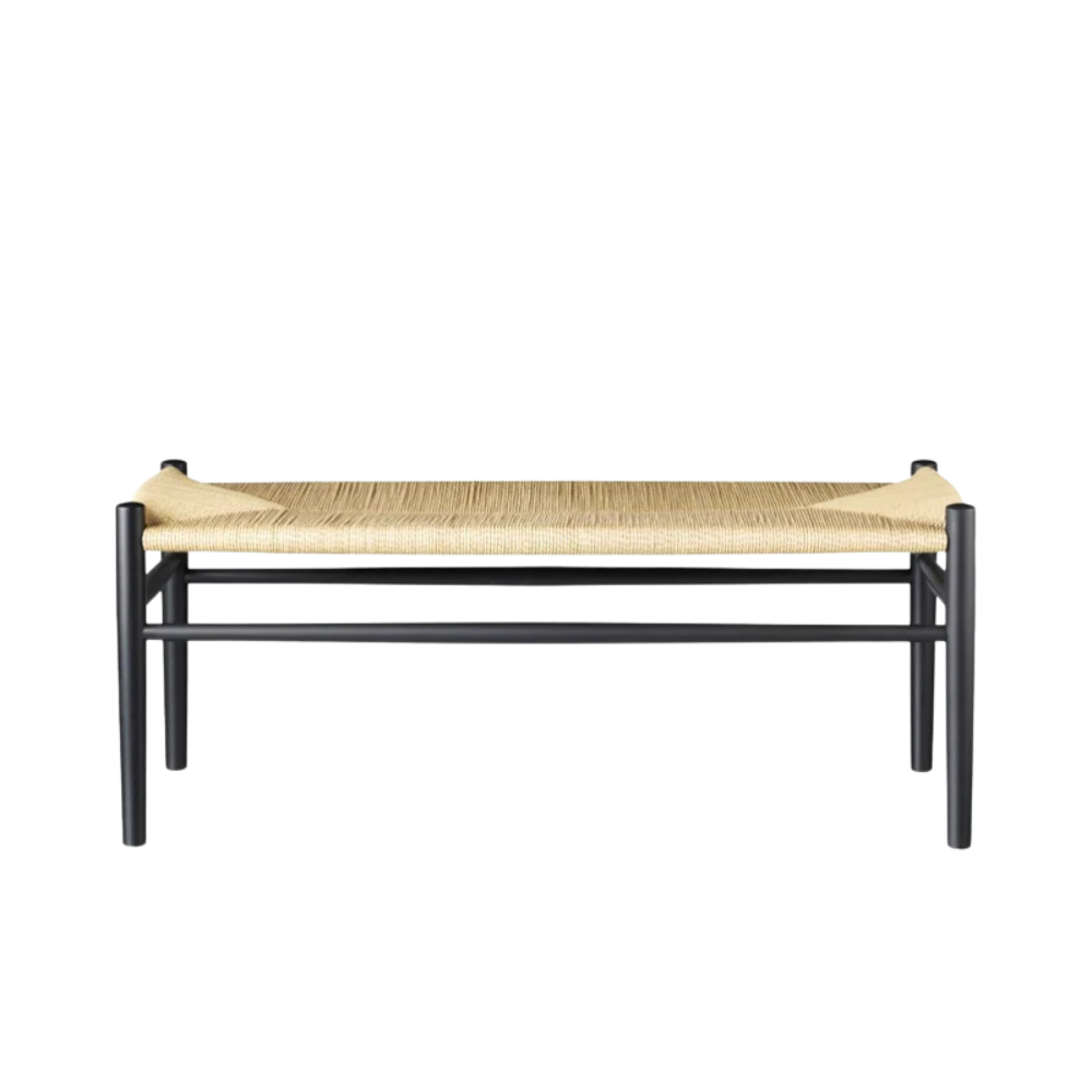 Bænken er udført i massivt bøgetræ, malet i en afdæmpet tone, der fremhæver træets struktur. Det håndflettede sæde i papercord giver en naturlig kontrast og en behagelig siddeoplevelse. Kombinationen af materialer og det enkle design gør bænken alsidig og tidløs.