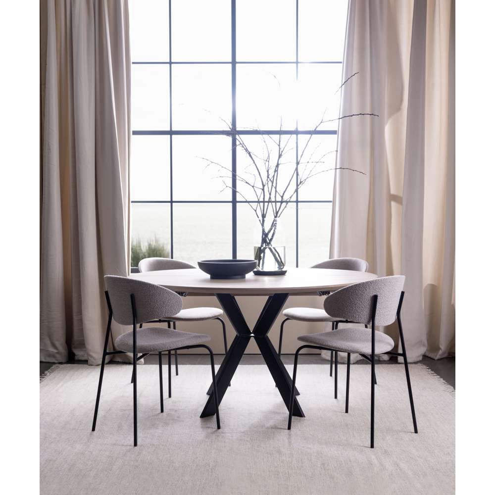 Monogram Steel spisebord er en elegant og moderne tilføjelse til ethvert spiserum. Dette bord kombinerer høj kvalitet med holdbarhed og funktionalitet, hvilket gør det til et ideelt valg til både formelle middage og andre sammenkomster. Bordet har en bordplade i massiv hvidolieret eg, og et solidt stel, som er behandlet med en speciel finish, der beskytter mod rust og slid, og derfor har lang levetid. Bordet er meget unikt i det at det kan fås i 7 størrelser fra Ø100 til Ø160 cm, hvilket gør det nemmere for dig at vælge den rigtige størrelse bord. Udover størrelse så kan monogram steel bordet også fås med anden bordpladetykkelse og bordpladekant. Bordet er meget funktionelt idet at bordets ben er påsat på midten af bordet, og derfor kan der skabes mere plads til de lange stænger, derudover kan bordet holde op til 4 tillægsplader. Dette bord er helt perfekt til din familie, som har brug for et bord med god mulighed for forlængelse, samt god benplads og sans for fine detaljer.\n\nDenne model kan fås i mange andre træsorter, farver og størrelser. Hvis du finder dette bord interessant, men ønsker en anden farve, størrelse eller har nogle andre spørgsmål til produktet, så er du mere end velkommen til at besøg os i Kjeps Bolighus eller kontakte os på mail eller telefon.