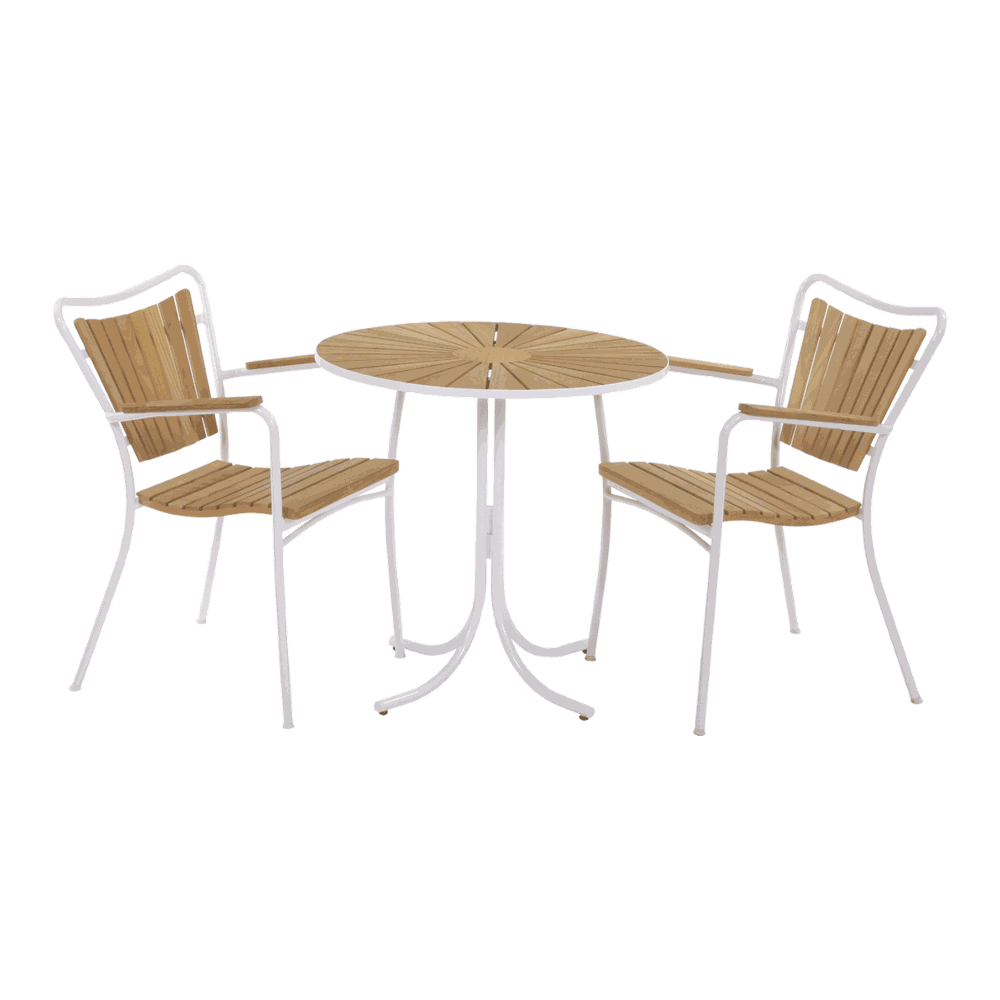 Dette smukke Marguerit cafésæt består af 1 x Marguerit cafébord Ø70 i hvid samt 2 x Marguerit havestole i hvid. Cafébordet er Ø70 cm med en højde på 68 cm - stadig nok til at havestolene kan gå ind under bordpladen. Bordpladen er i teak og stellet i pulverlakeret aluminium. Marguerit havestolene har ergonomisk sæde og ryg. Stellet er i pulverlakeret aluminium. Sæde, ryg og armlæn er i højkvalitetsteak.