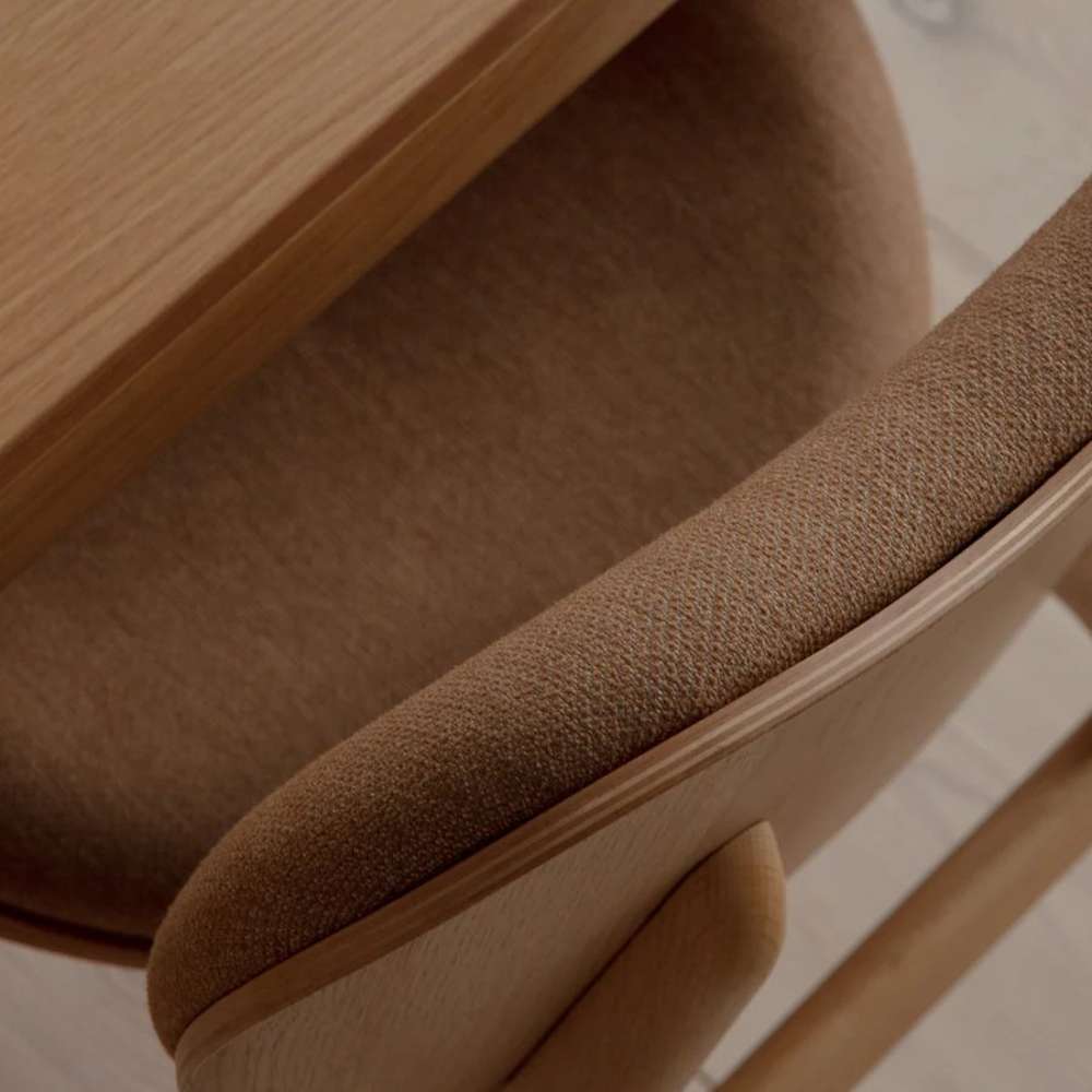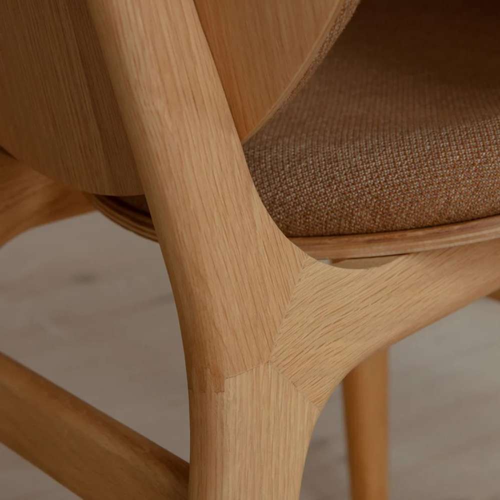 Designet er inspireret af nordisk æstetik med bløde former, naturlige materialer og sans for detaljen. Det massive egetræ tilfører varme og tyngde, mens det bløde tekstil giver kontrast og komfort. Resultatet er en spisebordsstol med armlæn, der kombinerer håndværk, funktion og en visuel lethed.