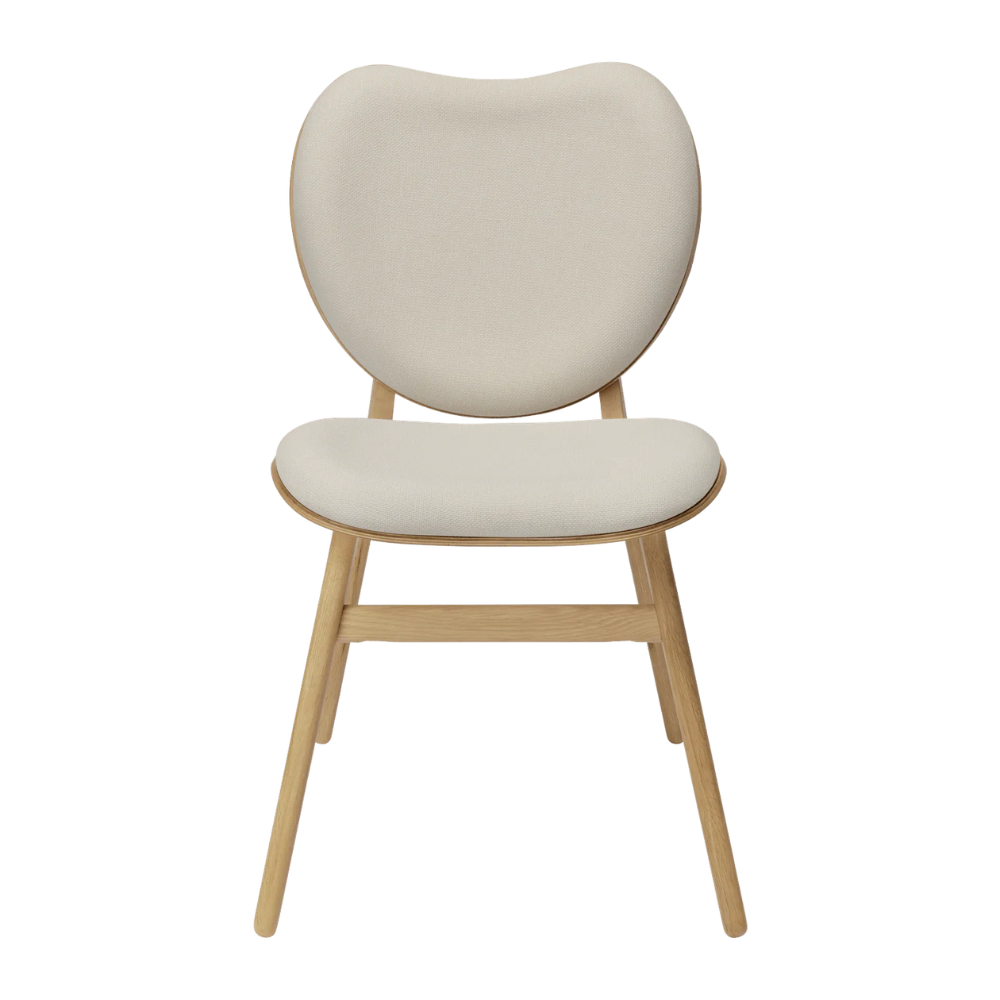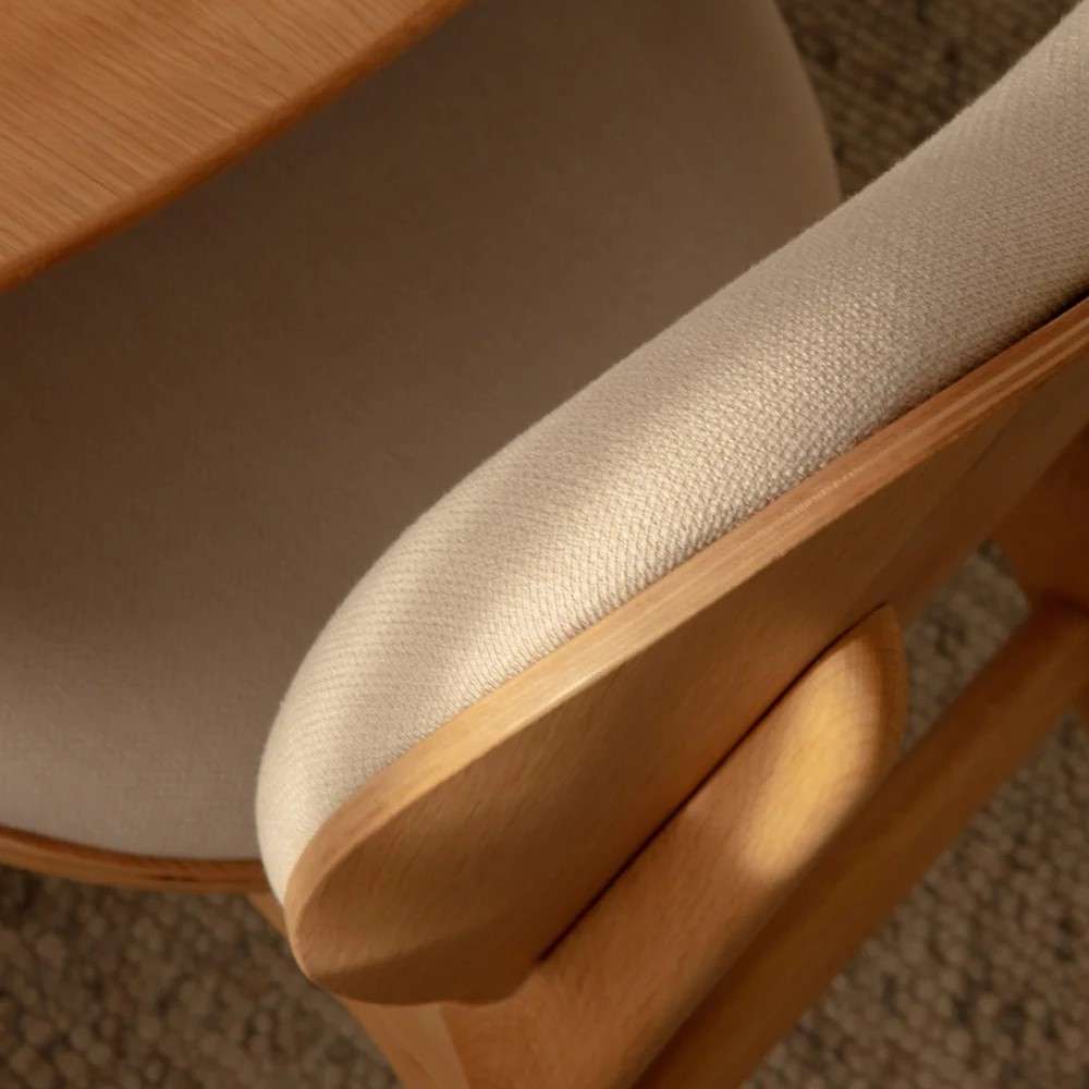 Designet er inspireret af nordisk æstetik med bløde former, naturlige materialer og sans for detaljen. Det massive egetræ tilfører varme og tyngde, mens det bløde tekstil giver kontrast og komfort. Resultatet er en spisebordsstol med armlæn, der kombinerer håndværk, funktion og en visuel lethed.
