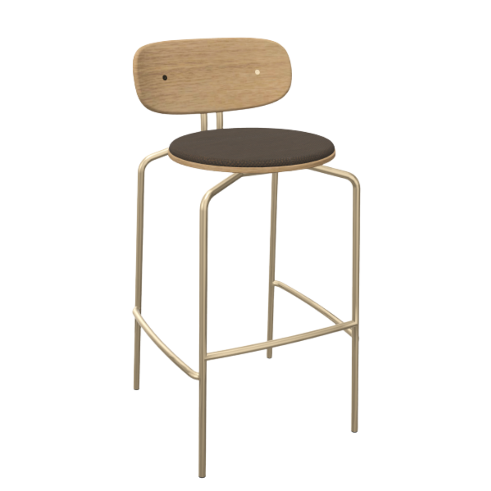 Curious barstolen fra Umage er her opgraderet med en polstret sædehynde i blød, genanvendt polyester – en kombination af æstetik og komfort i smuk balance. Den varme egefiner møder et elegant stel i messing og en dæmpet, behagelig siddeflade, der løfter oplevelsen i både køkken og lounge.