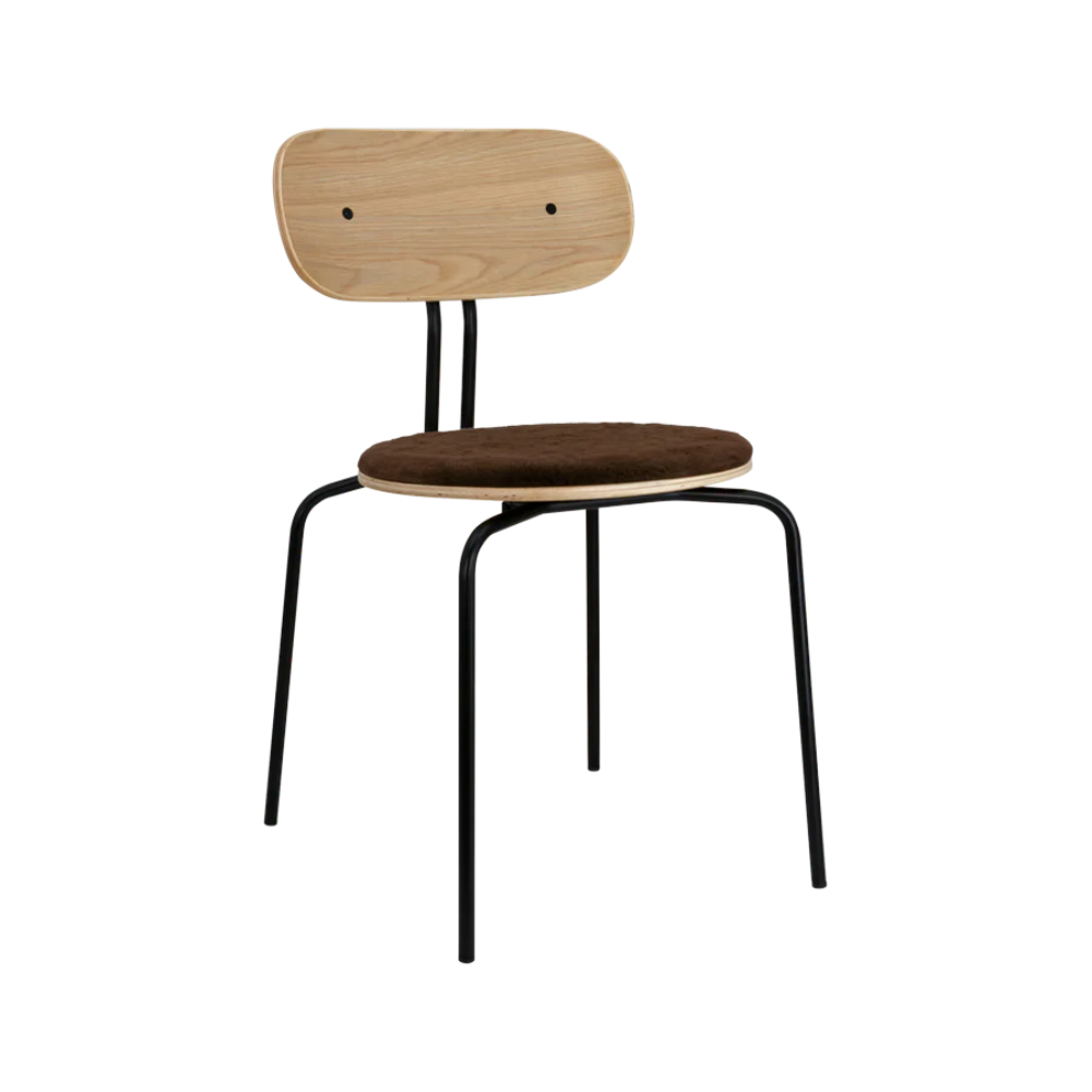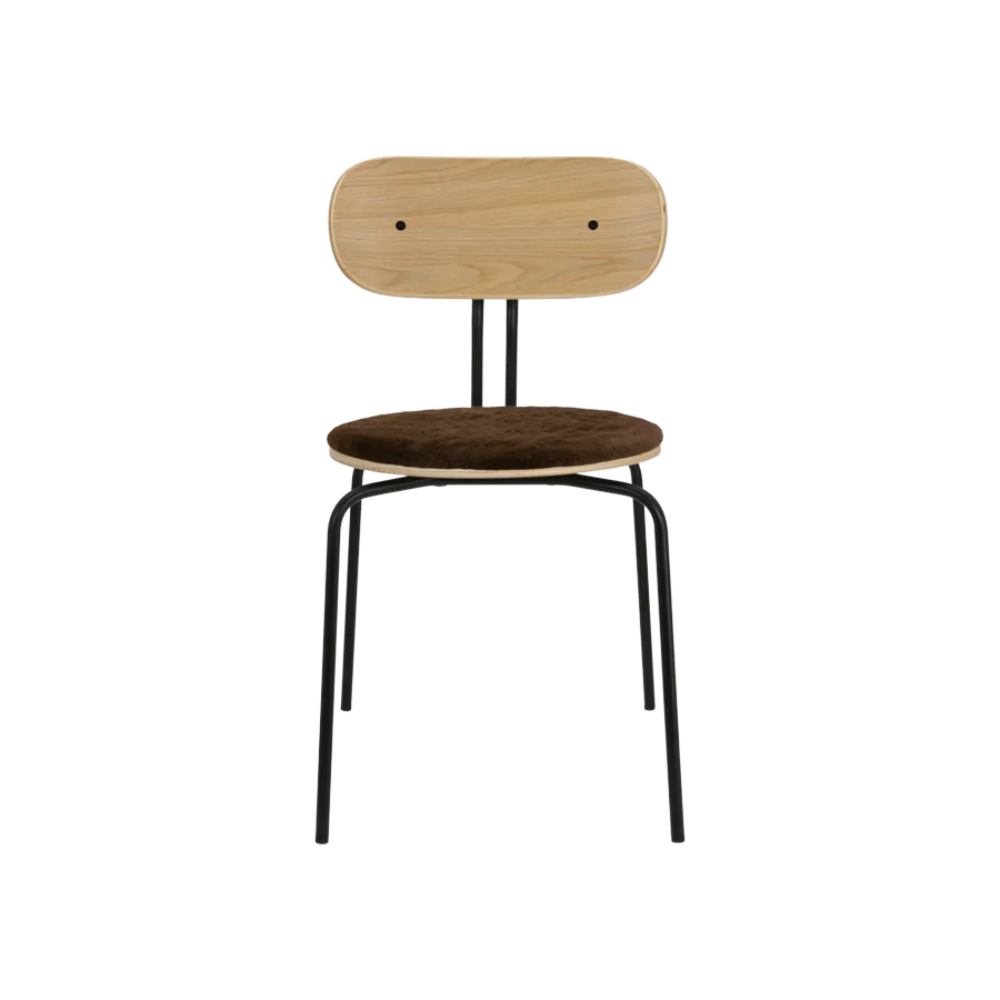 Umage Curious spisebordsstol forener naturlige materialer og bløde former i et let og funktionelt design. Det sorte stålstel giver stolen et markant udtryk, som står i smuk kontrast til det varme egefiner og den indbydende teddy-polstring.