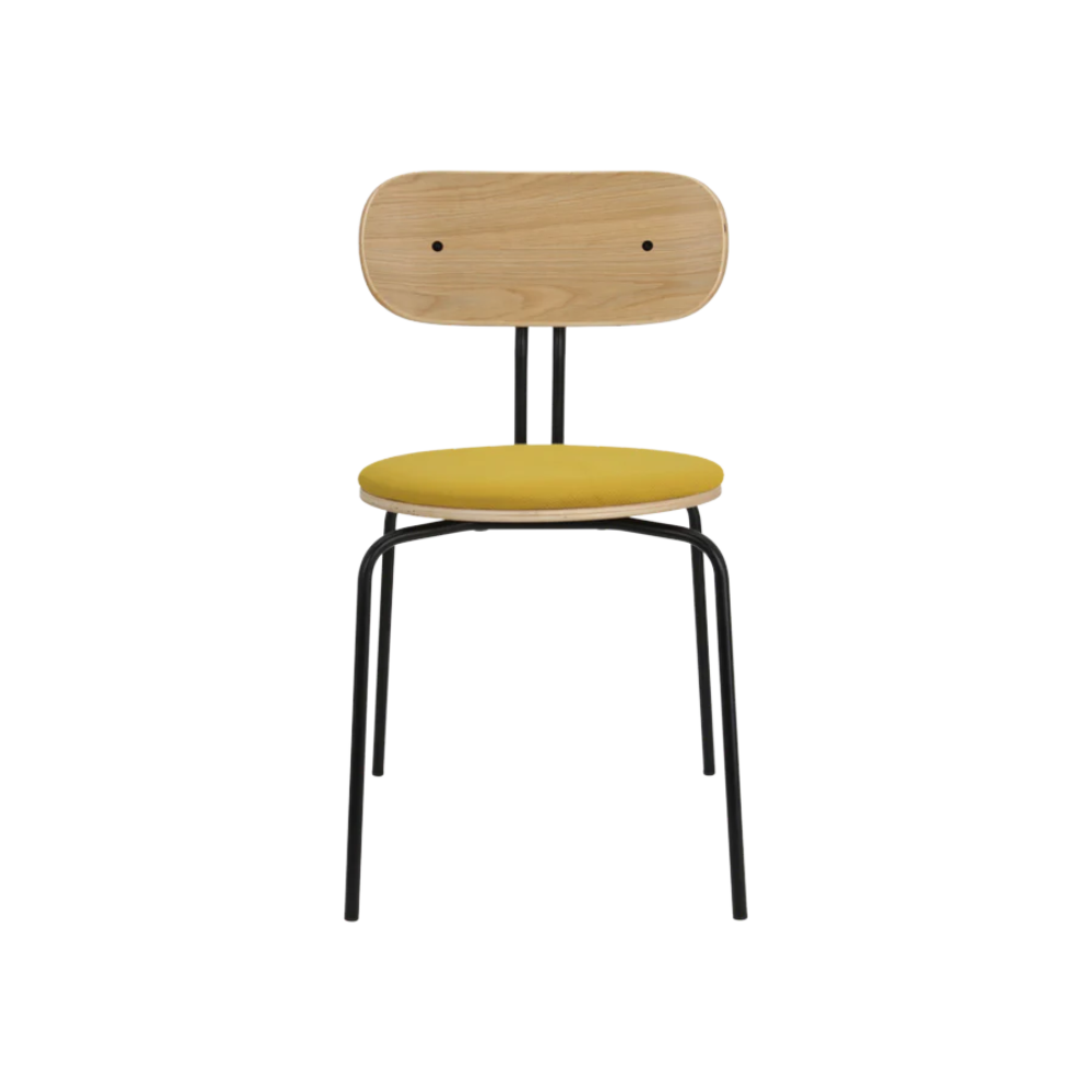Umage Curious spisebordsstol kombinerer lethed og styrke i ét gennemtænkt design. Med et stel i sort pulverlakeret stål og sæde i egefiner, betrukket med blødt, genanvendt polyester, får du en stol der balancerer bæredygtighed og æstetik.