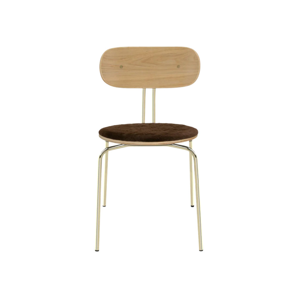 Umage Curious spisebordsstol er en let og elegant stol, der kombinerer klassiske materialer med moderne komfort. Den bløde teddy-polstring og varme toner i egefiner og messing giver stolen et indbydende udtryk – perfekt til både hverdagsmåltider og lange aftener ved bordet.