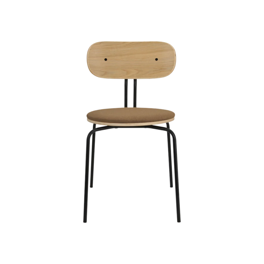 Umage Curious spisebordsstol kombinerer lethed og styrke i ét gennemtænkt design. Med et stel i sort pulverlakeret stål og sæde i egefiner, betrukket med blødt, genanvendt polyester, får du en stol der balancerer bæredygtighed og æstetik.
