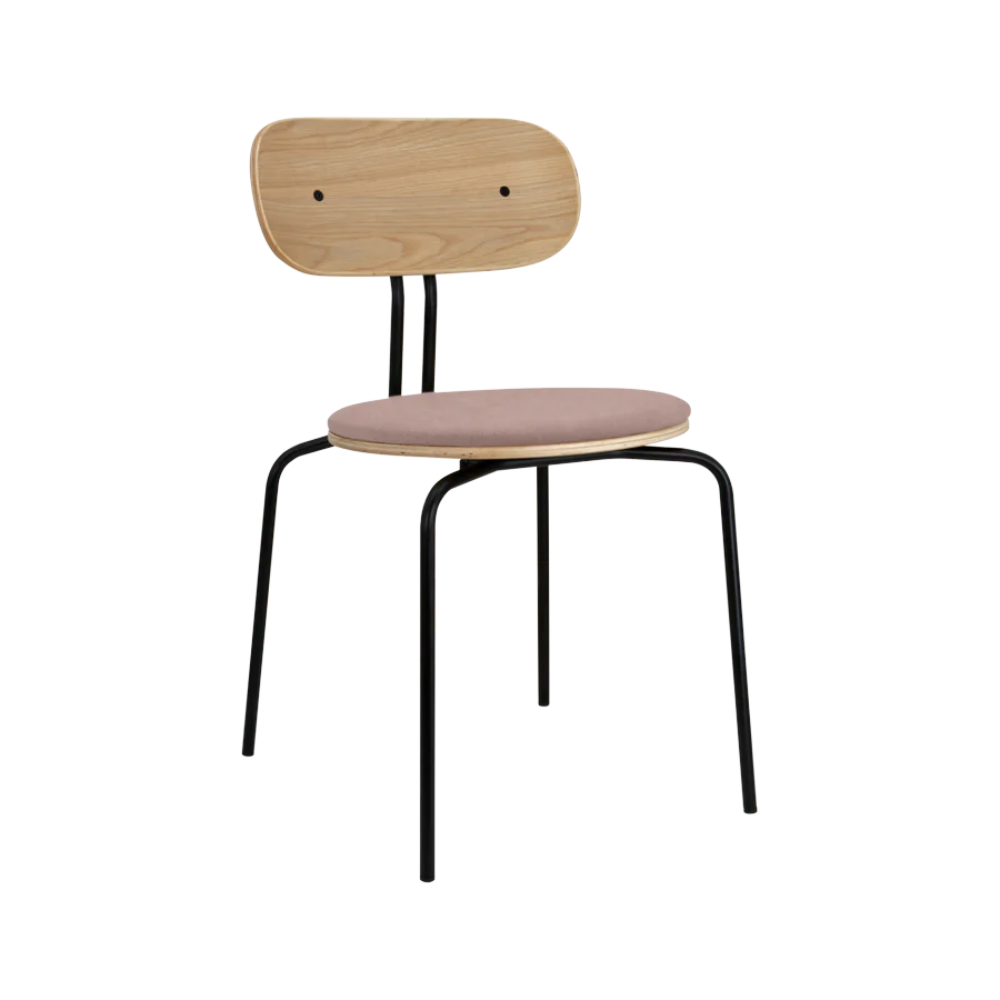 Umage Curious spisebordsstol kombinerer lethed og styrke i ét gennemtænkt design. Med et stel i sort pulverlakeret stål og sæde i egefiner, betrukket med blødt, genanvendt polyester, får du en stol der balancerer bæredygtighed og æstetik.