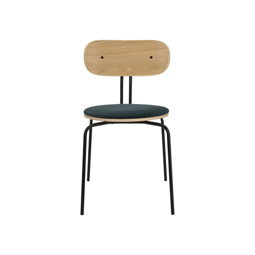 Umage Curious spisebordsstol kombinerer lethed og styrke i ét gennemtænkt design. Med et stel i sort pulverlakeret stål og sæde i egefiner, betrukket med blødt, genanvendt polyester, får du en stol der balancerer bæredygtighed og æstetik.