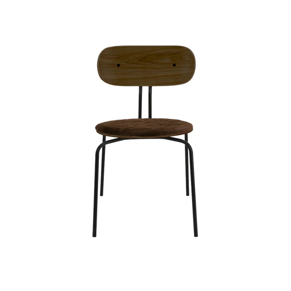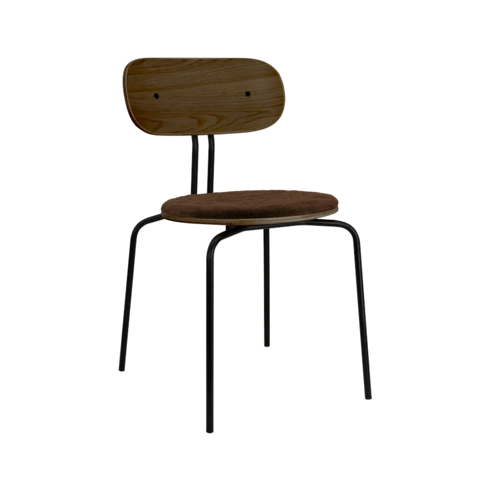 Umage Curious spisebordsstol forener skandinavisk elegance med høj komfort. I denne variant mødes det varme udtryk fra røget egefiner med et sort, pulverlakeret stel og et sæde i blød teddy polyester, som indbyder til lange middage og hyggelige stunder.