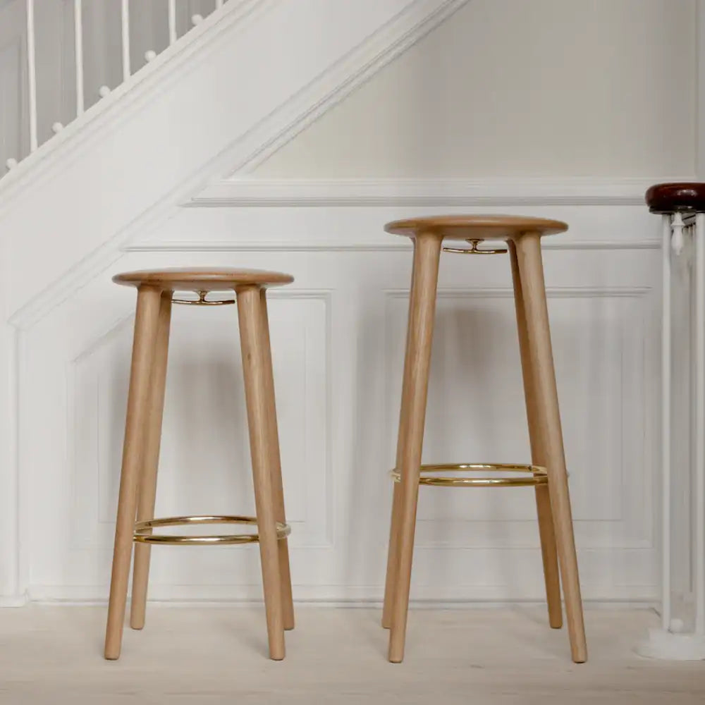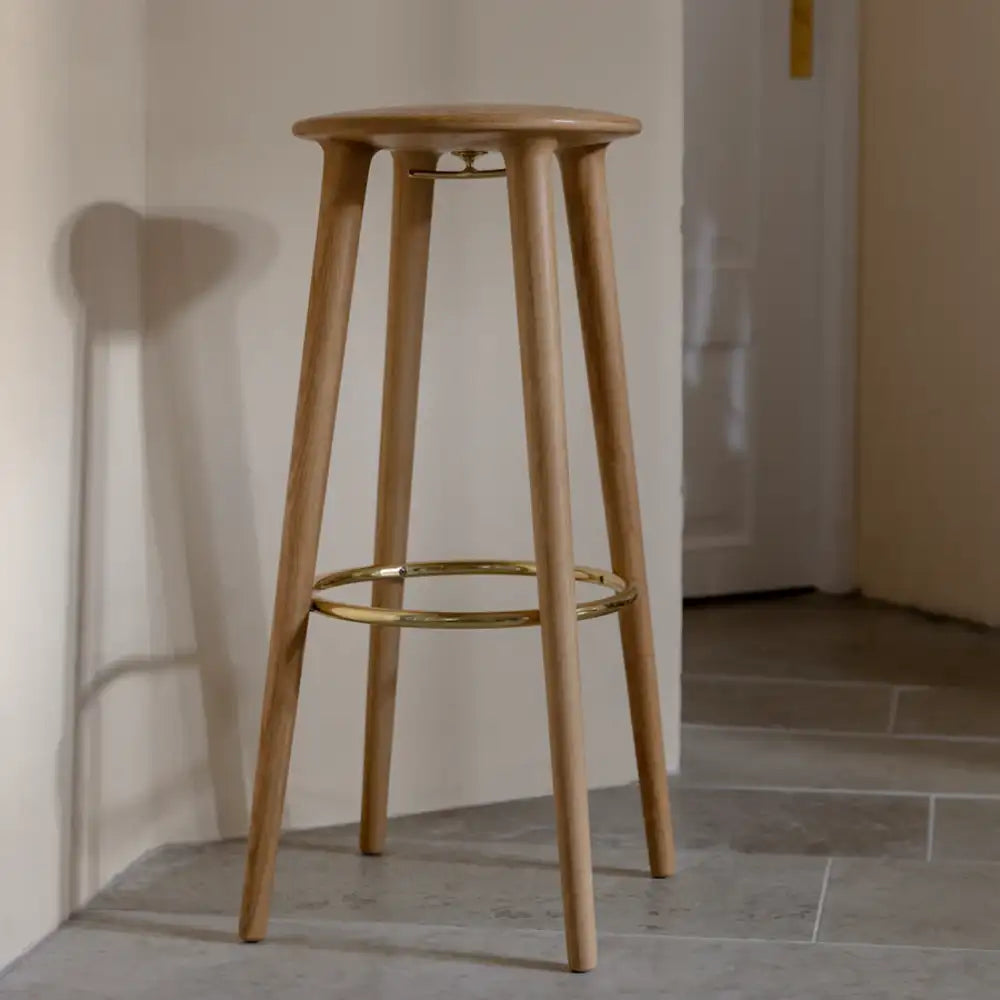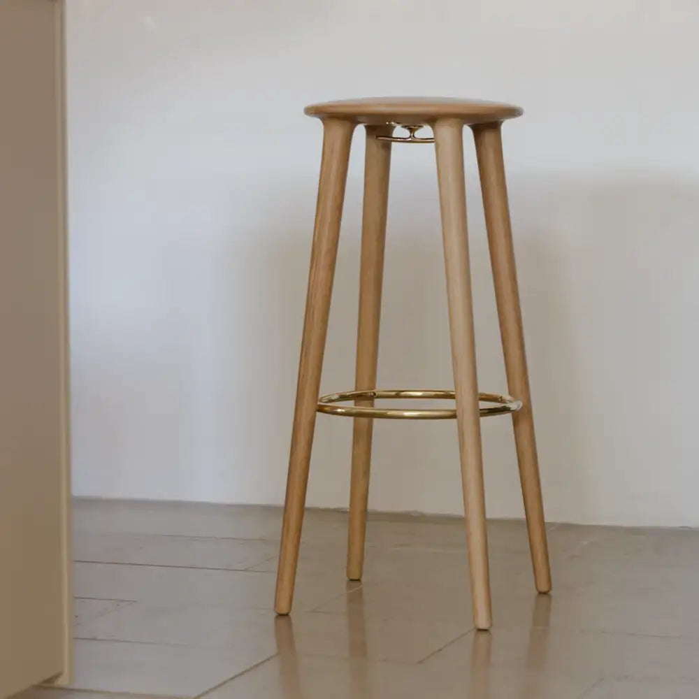 Det let buede sæde i lyst egetræ hviler smukt på en base af aluminium med messingdetaljer, og under sædet finder du en praktisk, integreret krog – en diskret men nyttig løsning til jakker, tasker eller viskestykker.